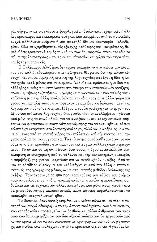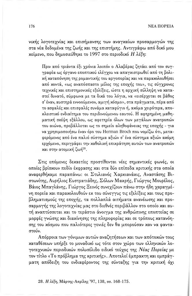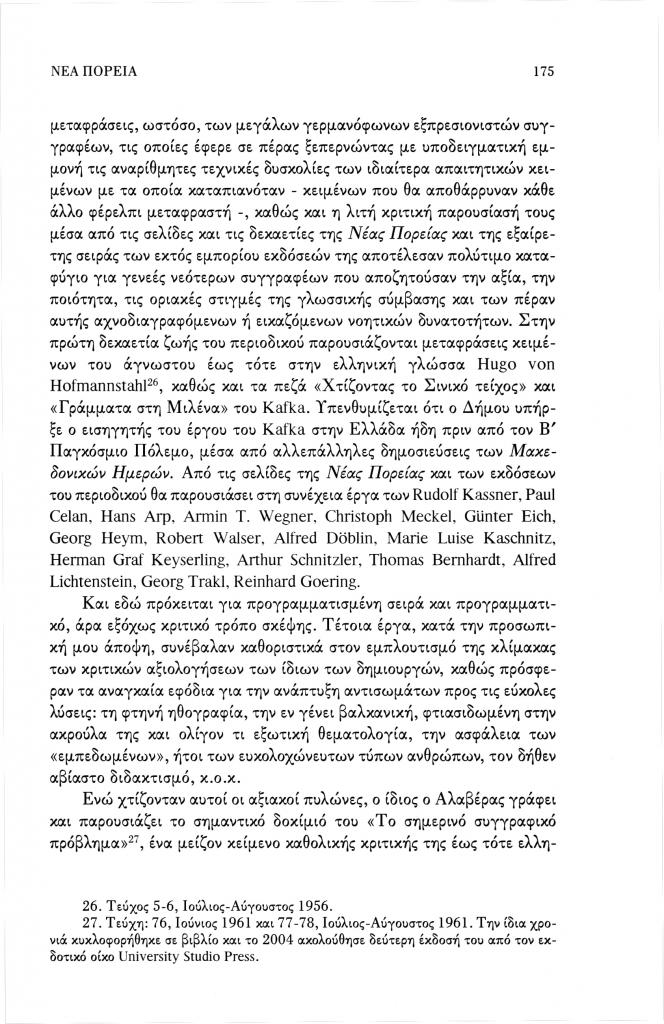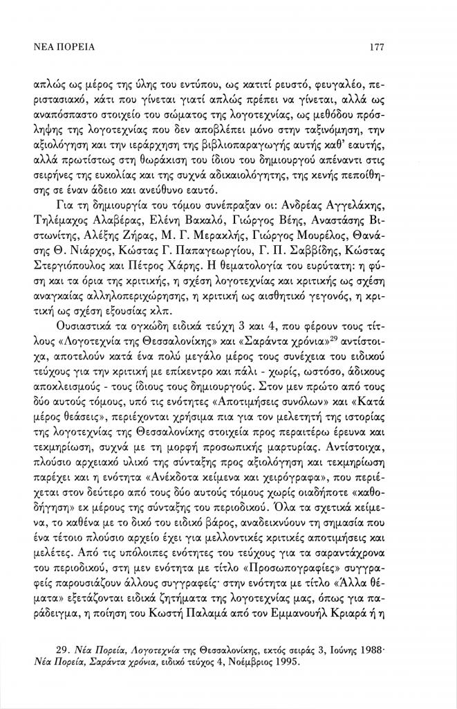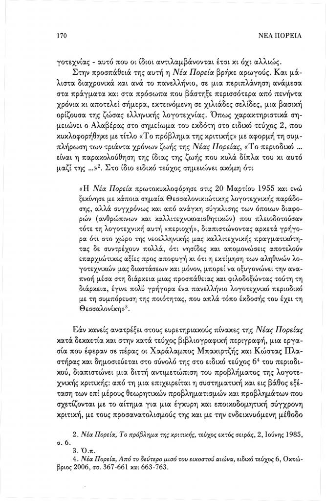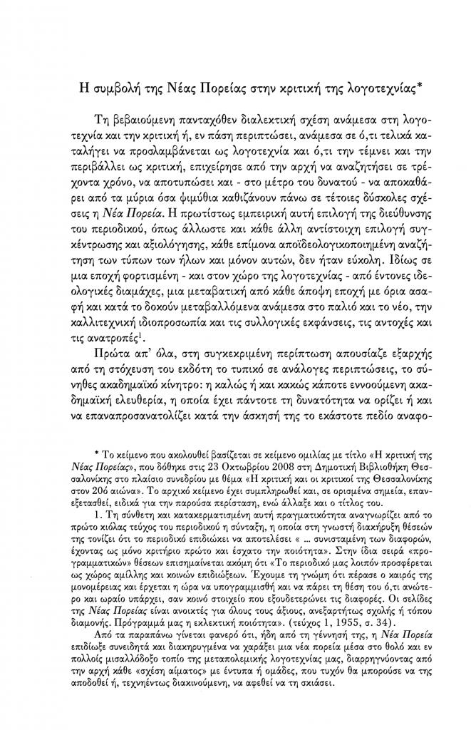 , «Η συμβολή της Νέας Πορείας στην κριτική της λογοτεχνίας», Νέα Πορεία, τόμ. 53, τχ. 626 (Απρίλιος-Ιούνιος 2007/ Φεβρουάριος 2009 2009), σ. 168-179