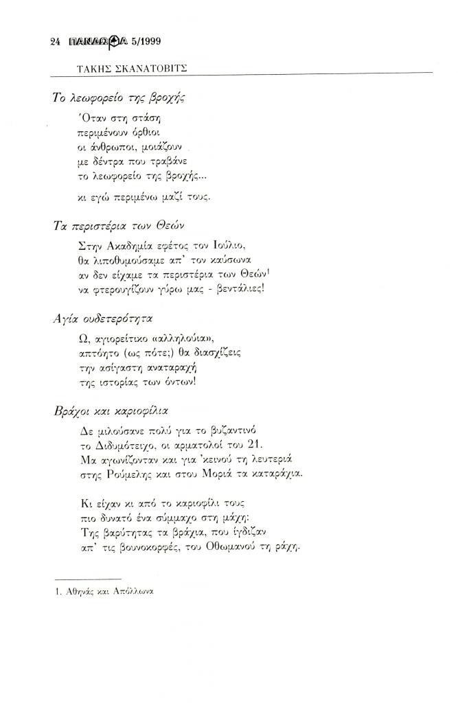 Σκανάτοβιτς Τάκης, «Βράχοι και καριοφίλια», Πανδώρα, τχ. 5 ( 1999), σ. 24