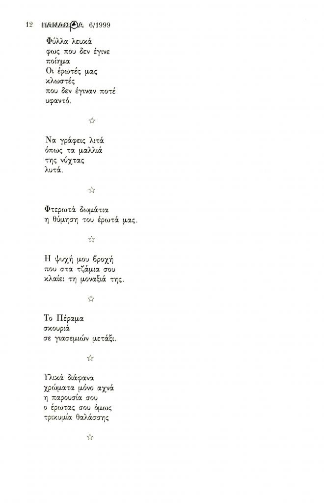 Παπαοικονόμου Γιάννης, «[Φύλλα λευκά]», Πανδώρα, τχ. 6 (Νοέμβριος 1999-Απρίλιος 2000 2000), σ. 12