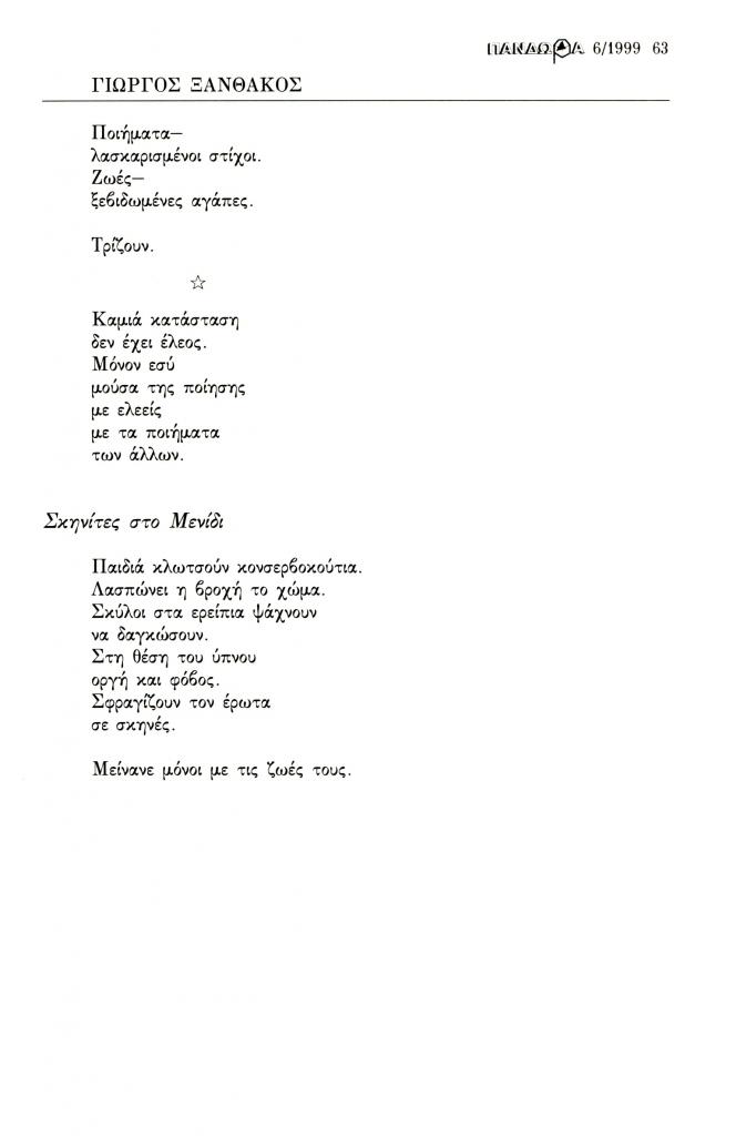 Ξανθάκος Γιώργος, «Σκηνίτες στο Μενίδι», Πανδώρα, τχ. 6 (Νοέμβριος-Απρίλιος 2000), σ. 63