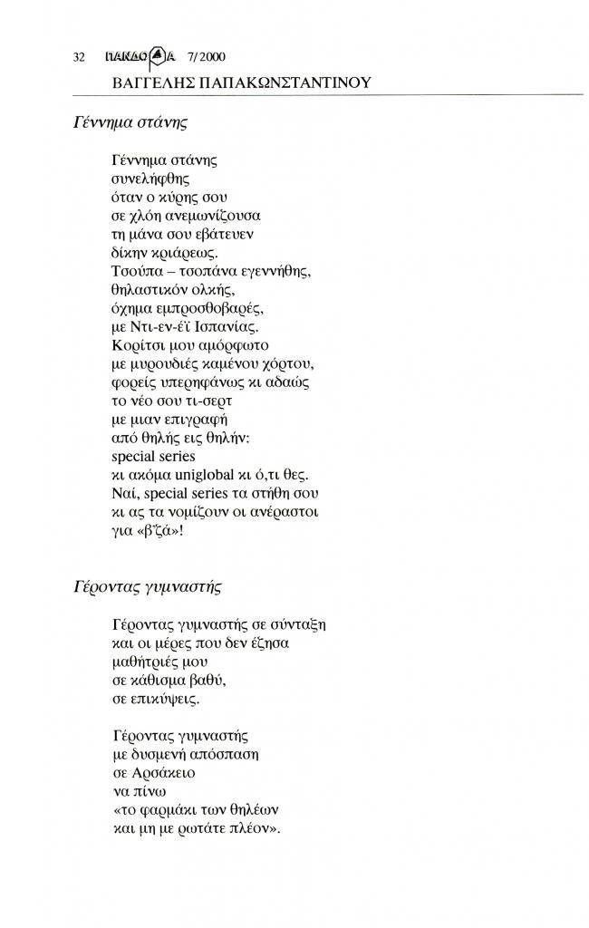Παπακωνσταντίνου Βαγγέλης, «Γέννημα στάνης», Πανδώρα, τχ. 7 (Μάιος-Οκτώβριος 2000), σ. 32