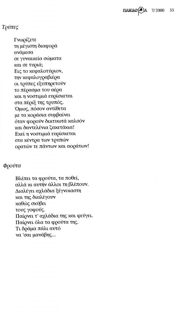 Παπακωνσταντίνου Βαγγέλης, «Φρούτα», Πανδώρα, τχ. 7 (Μάιος-Οκτώβριος 2000), σ. 33
