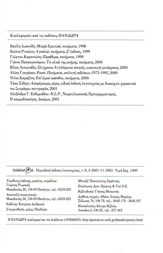 «Κυκλοφορούν από τις εκδόσεις Πανδώρα», Πανδώρα, τχ. 9 (Μάιος-Νοέμβριος 2001), σ. (έσω οπισθόφυλλο)