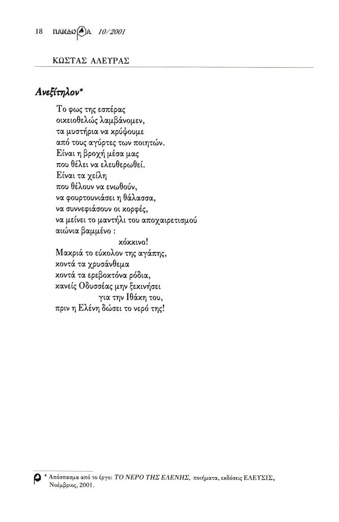 Αλευράς Κώστας, «Ανεξίτηλον», Πανδώρα, τχ. 10 (Νοέμβριος 2001-Μάιος 2002 2002), σ. 18