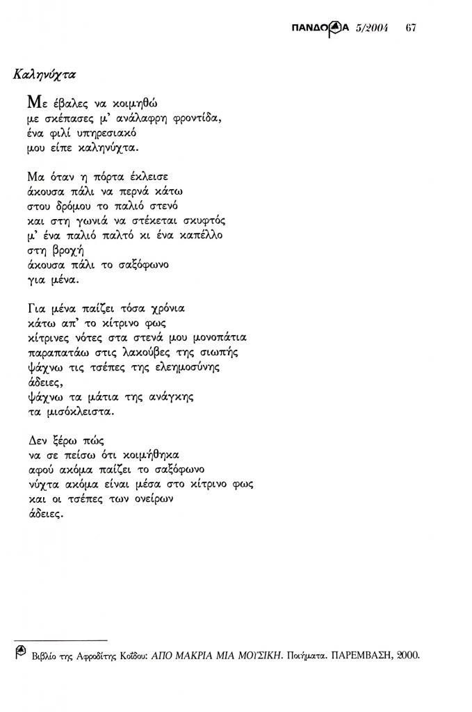 Κοΐδου Αφροδίτη, «Καληνύχτα», Πανδώρα, τχ. 15 (Μάιος-Νοέμβριος 2004), σ. 67