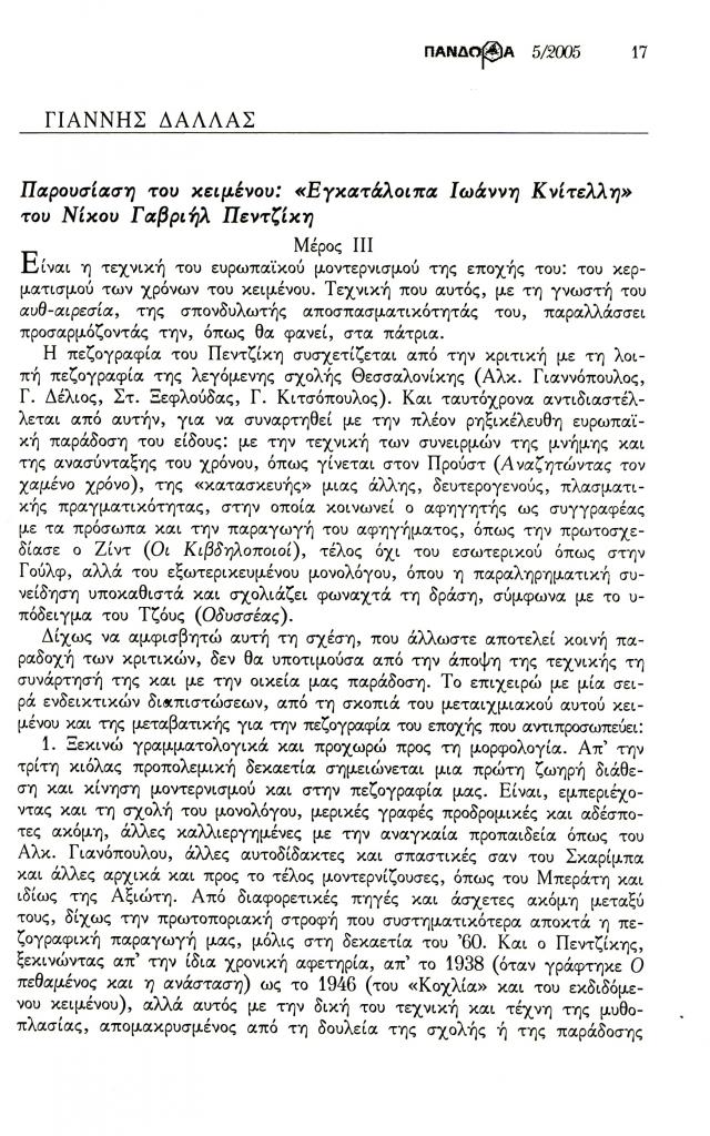 Δάλλας Γιάννης, «Παρουσίαση του κειμένου: Εγκατάλοιπα Ιωάννη Κνίτελλη του Νίκου Γαβριήλ Πεντζίκη», Πανδώρα, τχ. 17 (Μάιος-Νοέμβριος 2005), σ. 17-20