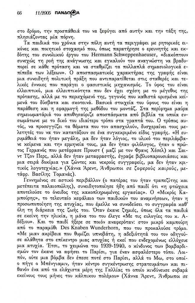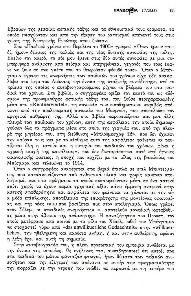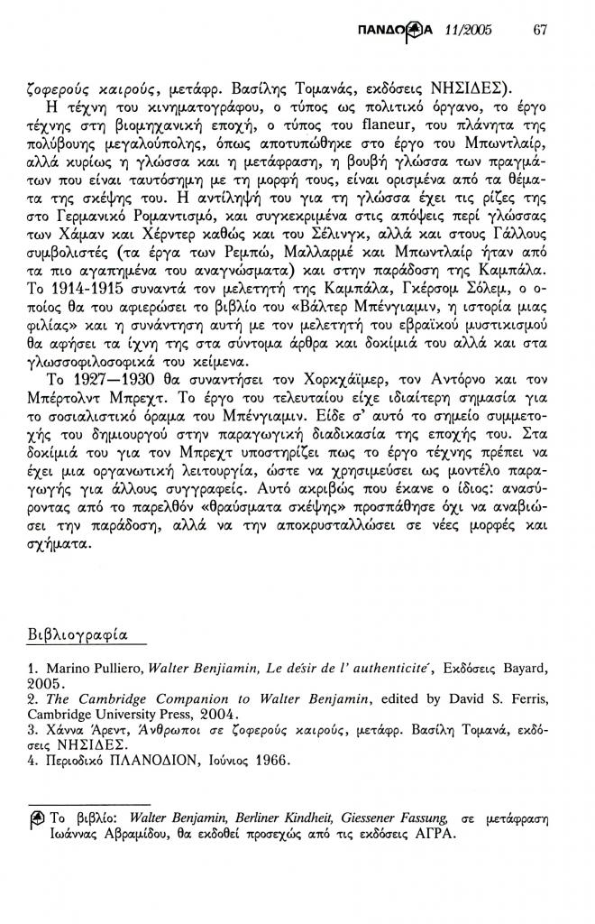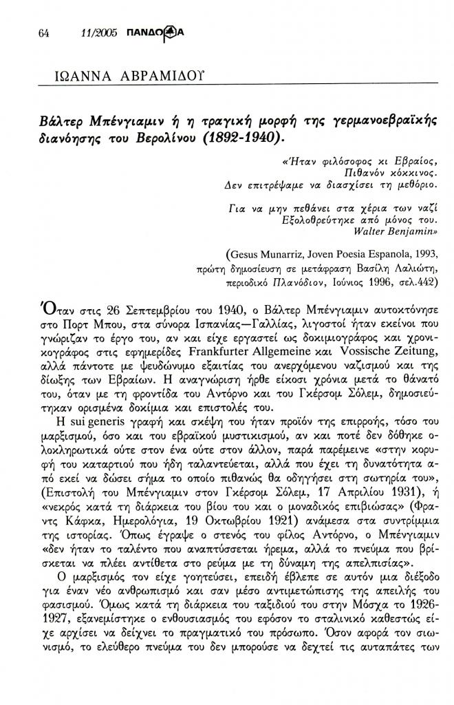 , «Βάλτερ Μπένγιαμιν ή η τραγική μορφή της γερμανοεβραϊκής διανόησης του Βερολίνου (1892-1940)», Πανδώρα, τχ. 18 (Νοέμβριος 2005-Μάιος 2006 2006), σ. 64-67