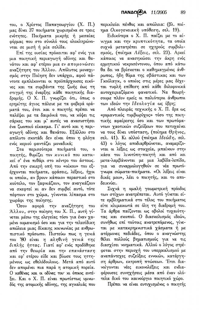 , «Επιλογές και θέματα κριτικής. Χρίστος Παπαγεωργίου, Ο τοίχος σημαία. Ποιήματα, εκδόσεις Ύψιλον/Βιβλία, 2005», Πανδώρα, τχ. 18 (Νοέμβριος 2005-Μάιος 2006 2006), σ. 88-90