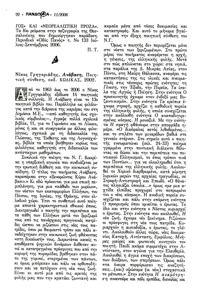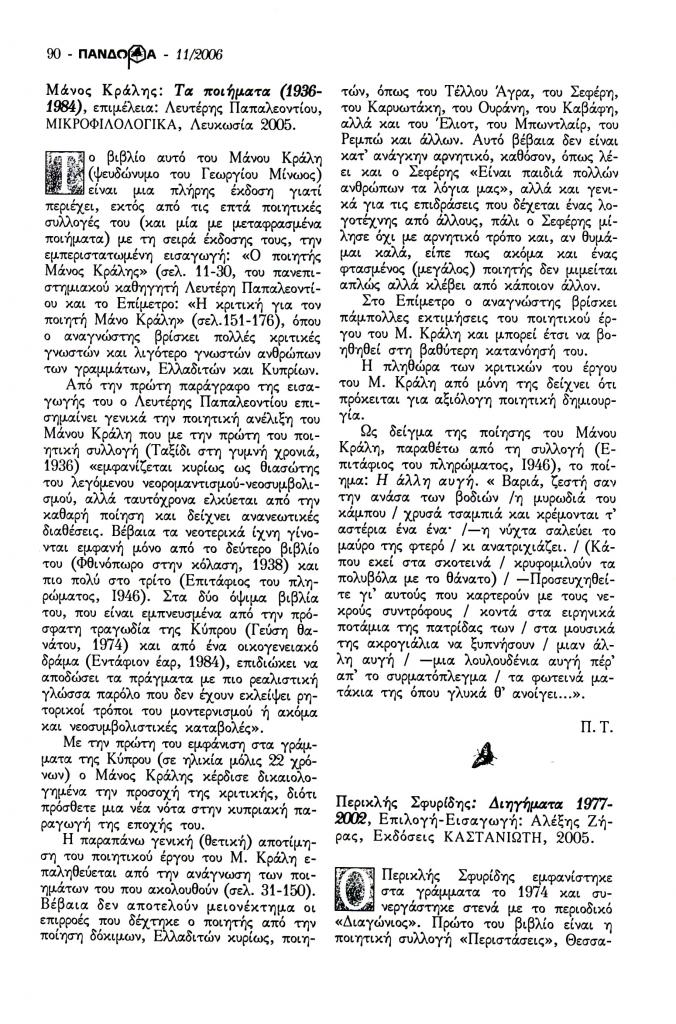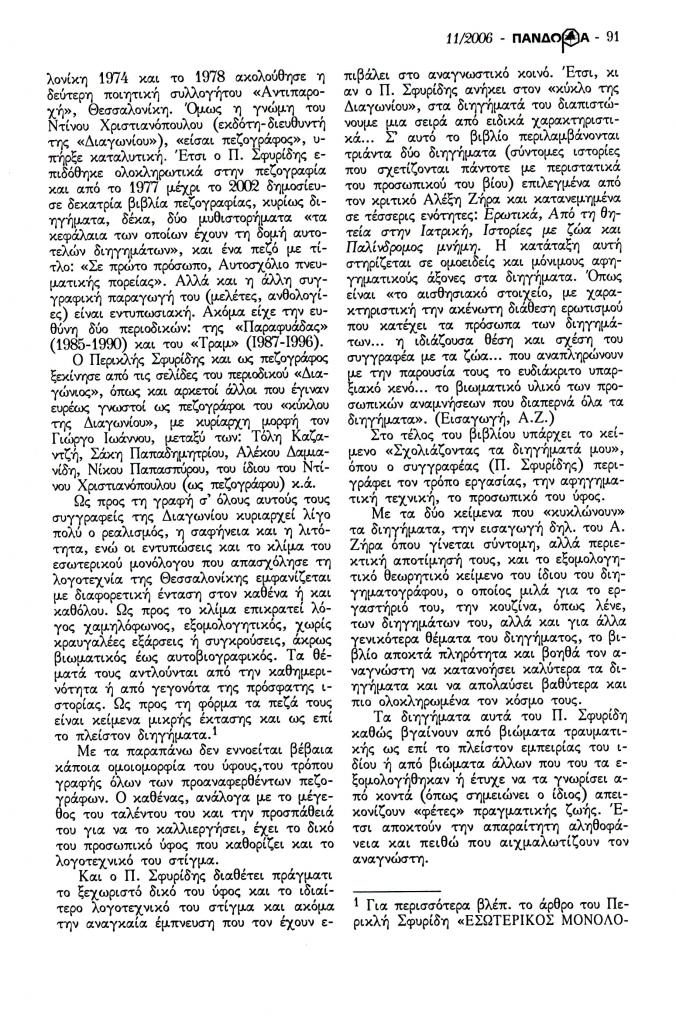 Τσελίκης Περικλής, «Επιλογές και θέματα κριτικής. Περικλής Σφυρίδης: Διηγήματα 1977-2002, Επιλογή-Εισαγωγή: Αλέξης Ζήρας, Εκδόσεις Καστανιώτη, 2005», Πανδώρα, τχ. 19 (Νοέμβριος 2006-Μάιος 2007 2007), σ. 90-92