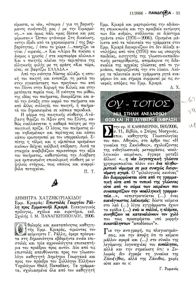 , «Επιλογές και θέματα κριτικής. Νίκος Γρηγοριάδης, Ανάβαση, Ποιητική σύνθεση, εκδ. Κώδικας, 2002», Πανδώρα, τχ. 19 (Νοέμβριος 2006-Μάιος 2007 2007), σ. 92-93
