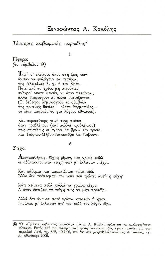 , «Τέσσερις καβαφικές παρωδίες. Γέφυρες (το σύμβολον Θ)»,