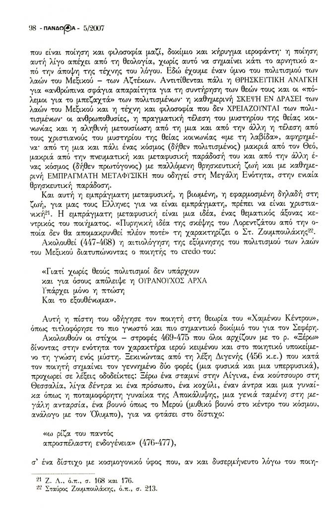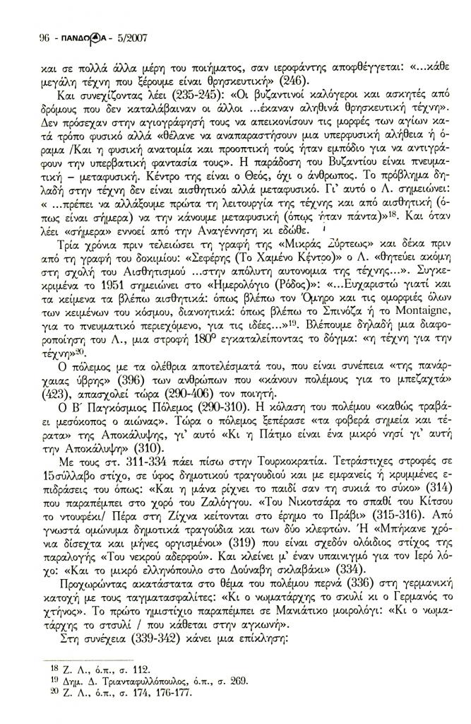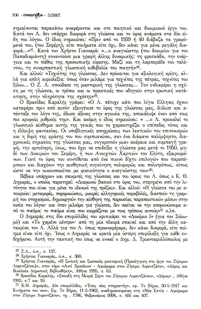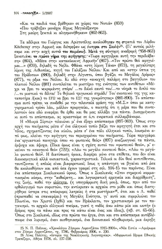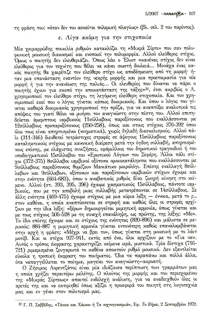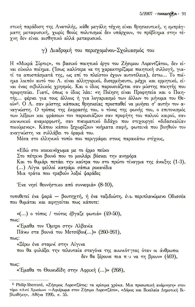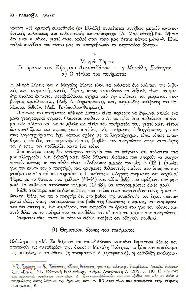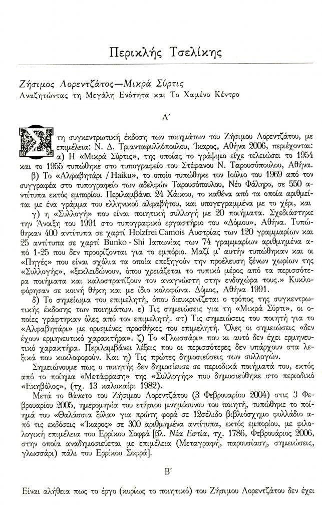 Τσελίκης Περικλής, «Ζήσιμος Λορεντζάτος-Μικρά Σύρτις. Αναζητώντας τη Μεγάλη Ενότητα και το Χαμένο Κέντρο», Πανδώρα, τχ. 20 (Μάιος-Νοέμβριος 2007), σ. 88-107