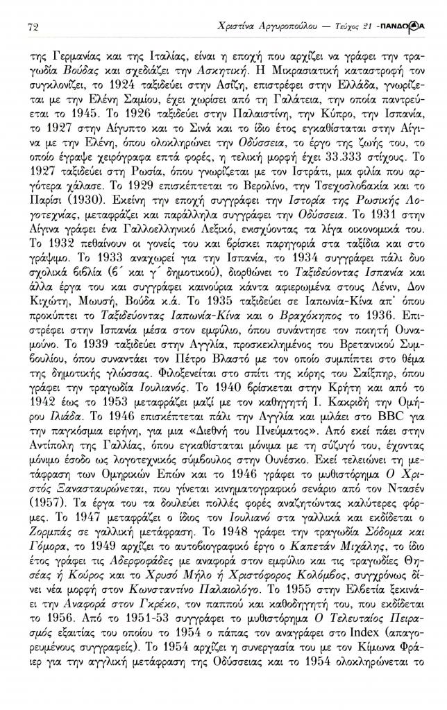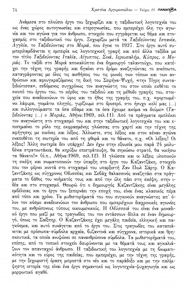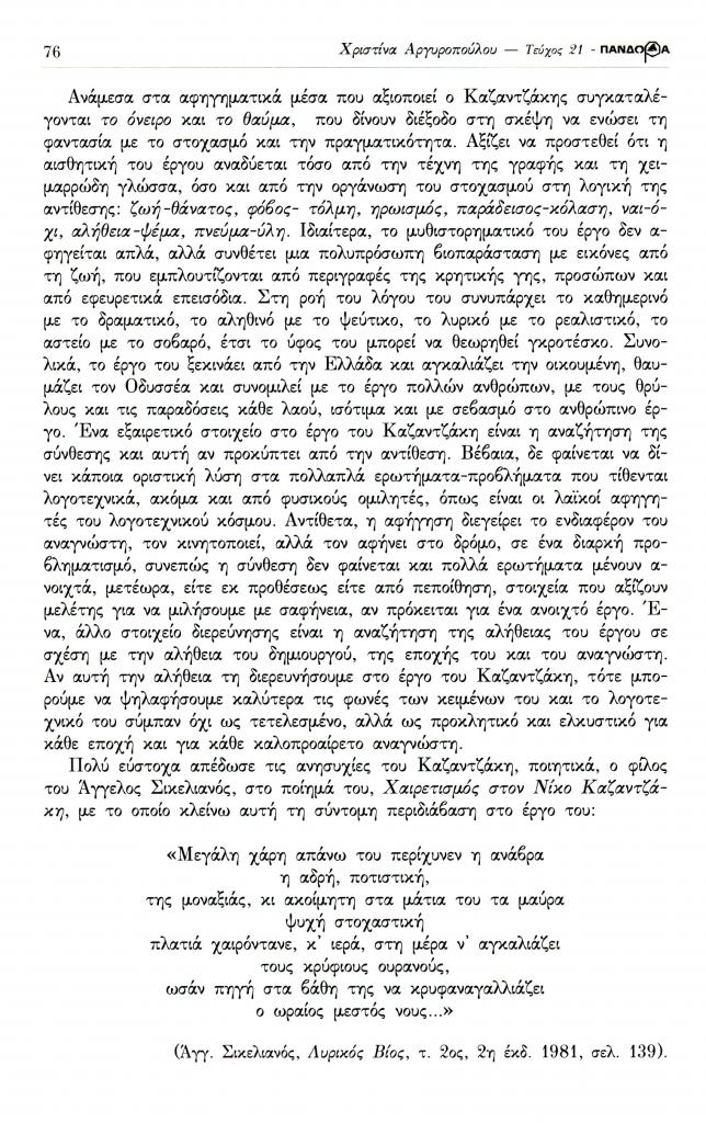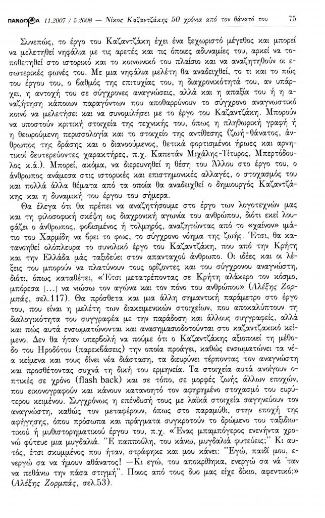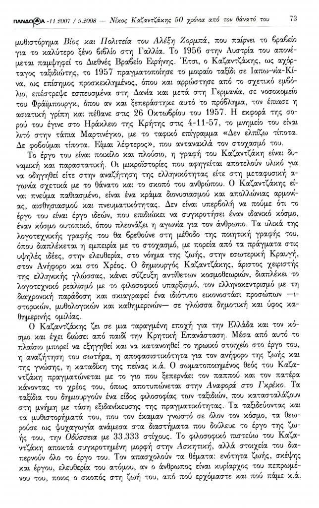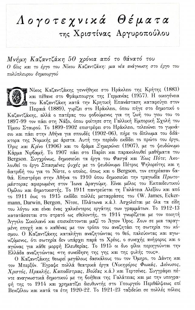 Αργυροπούλου Χριστίνα, «Λογοτεχνικά θέματα. Μνήμη Καζαντζάκη 50 χρόνια από το θάνατό του. Ο βίος και το έργο του Νίκου Καζαντζάκη: μια νέα ανάγνωση στο έργο του πολύπλευρου δημιουργού», Πανδώρα, τχ. 21 (Νοέμβριος 2007-Μάιος 2008 2008), σ. 71-76