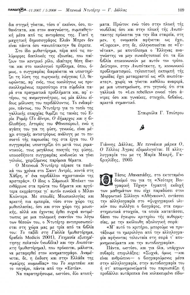 , «Κριτική και επιλογές. Μπενουά Ντυτέρτρ, Η Ανυπότακτη, Μετάφραση: Θωμάς Σκάσσης, Εστία, Αθήνα, 2006», Πανδώρα, τχ. 21 (Νοέμβριος 2007-Μάιος 2008 2008), σ. 108-109