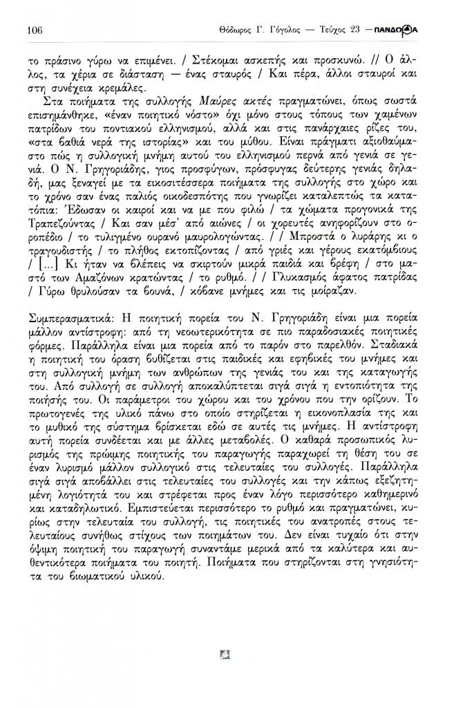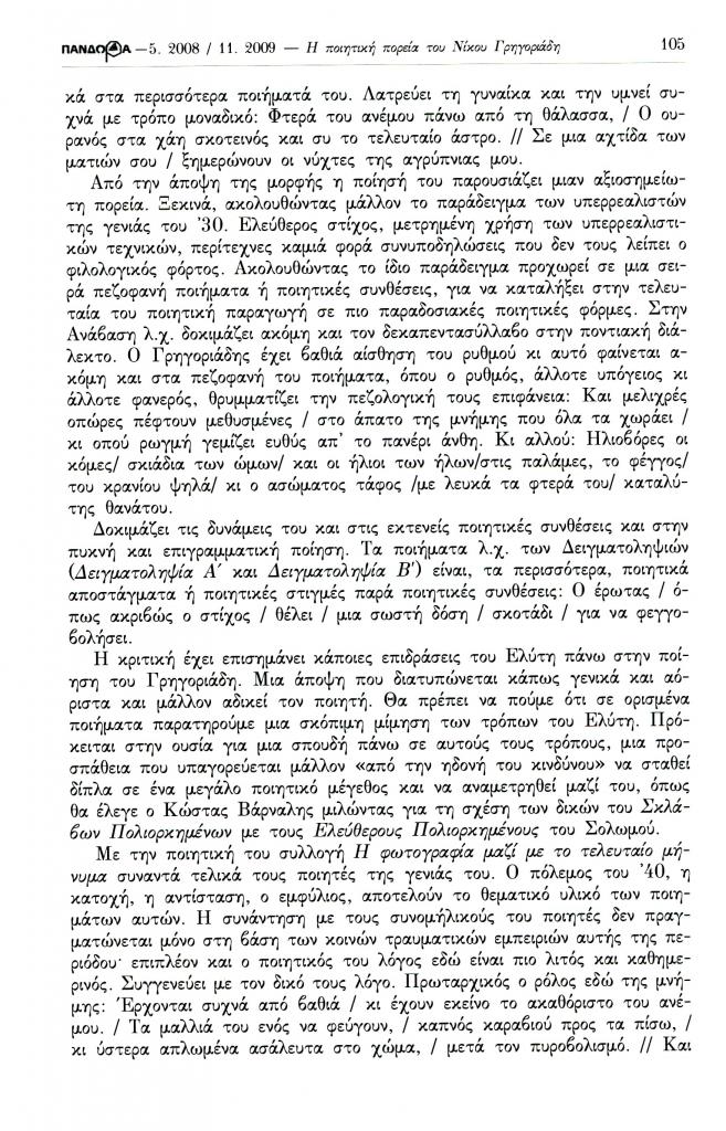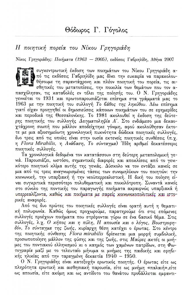 , «Η ποιητική πορεία του Νίκου Γρηγοριάδη. Νίκος Γρηγοριάδης, Ποιήματα (1963-2005), εκδόσεις Γαβριηλίδη, Αθήνα 2007», Πανδώρα, τχ. 23 (Νοέμβριος-Μάιος 2009), σ. 104-106