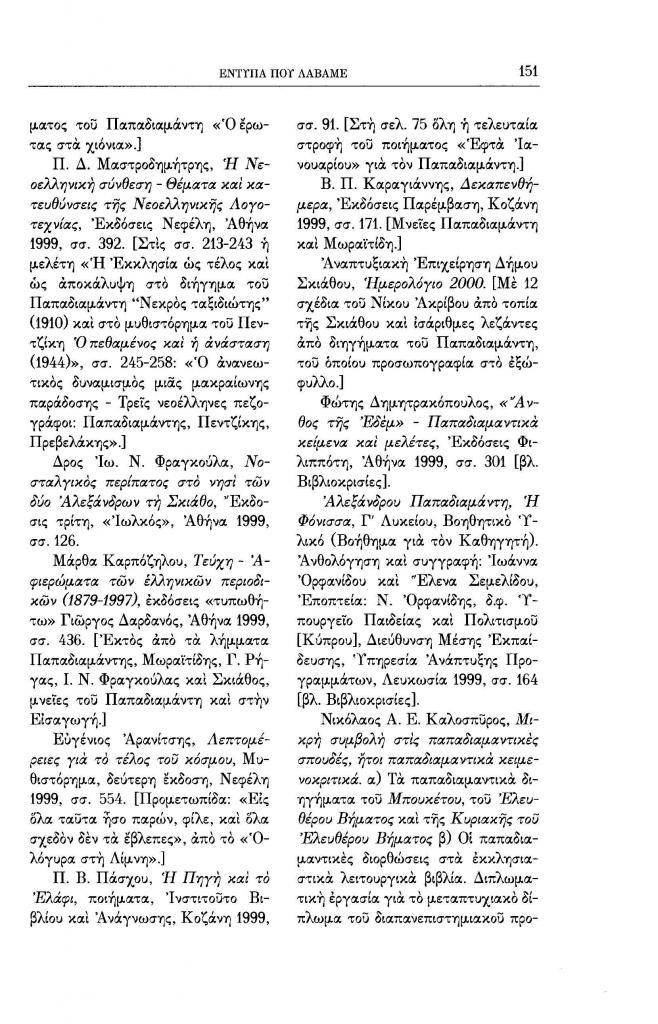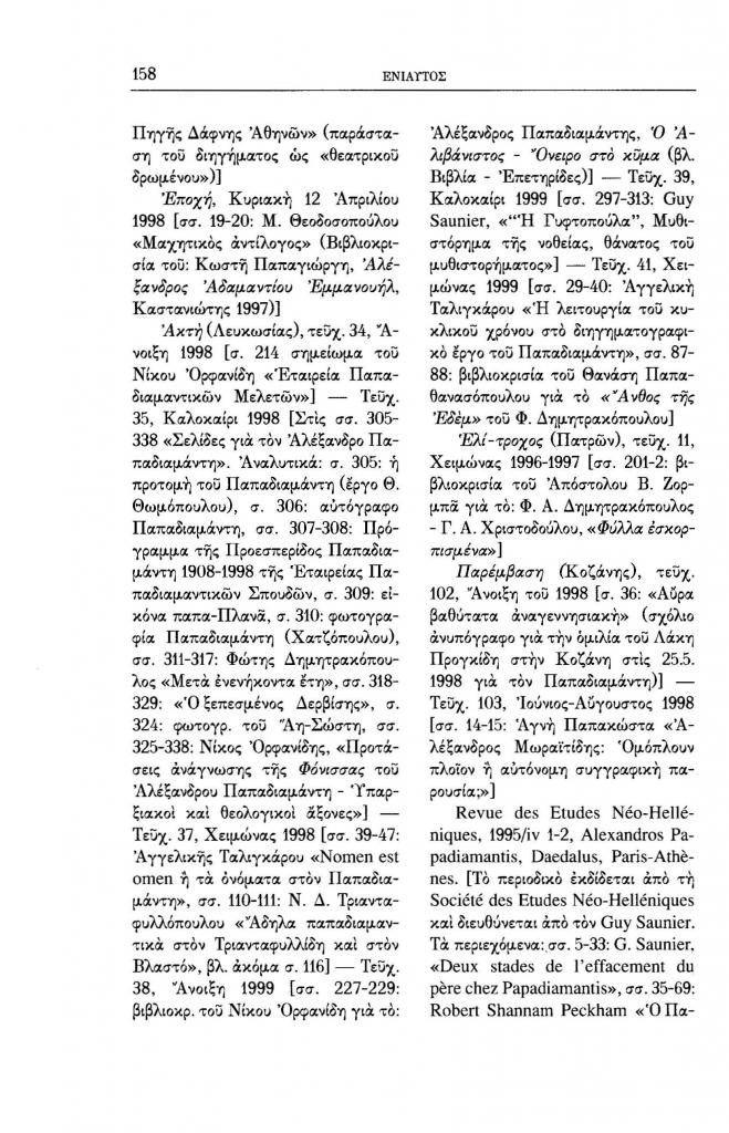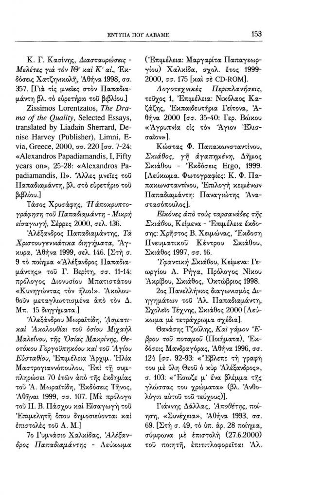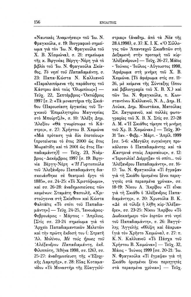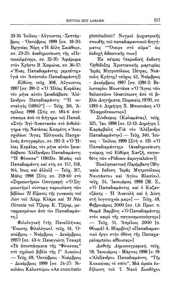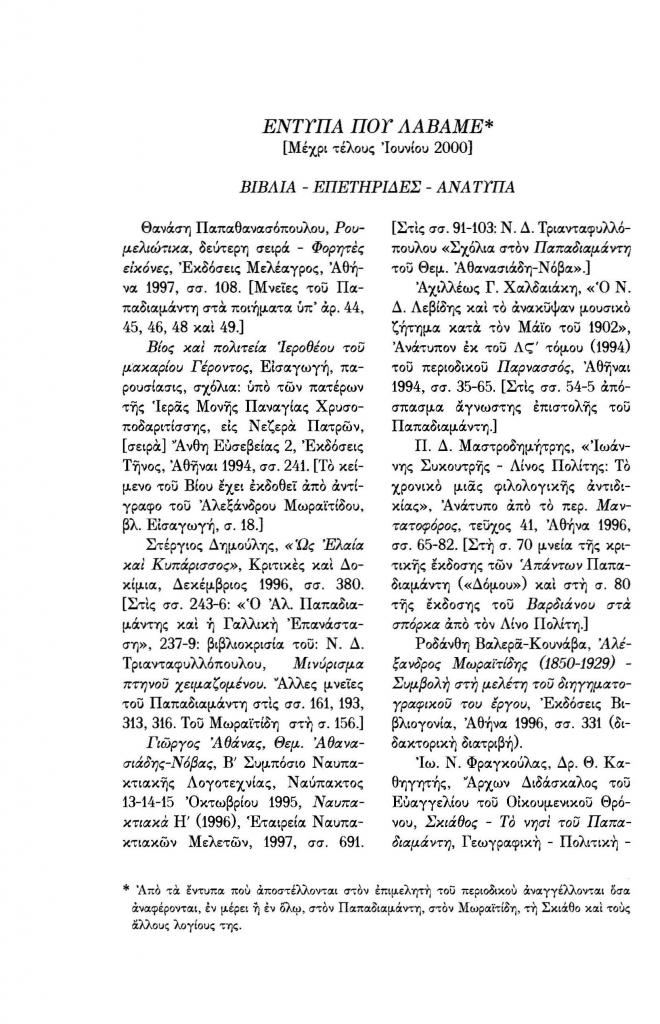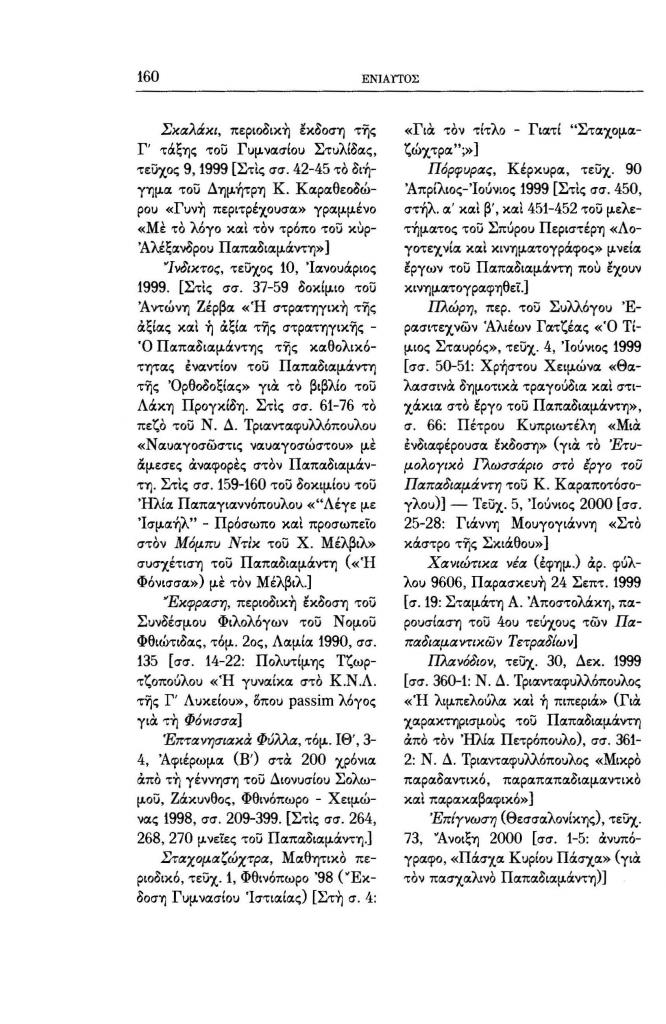 «Ενιαυτός. Έντυπα που λάβαμε [Μέχρι τέλους Ιουνίου 2000]», Παπαδιαμαντικά Τετράδια, τχ. 5 (Χριστούγεννα 2000), σ. 146-160