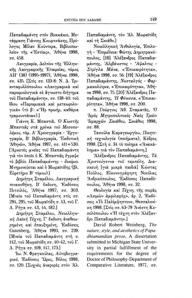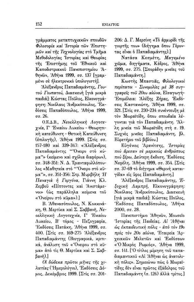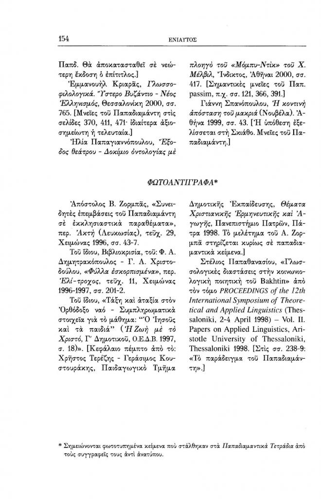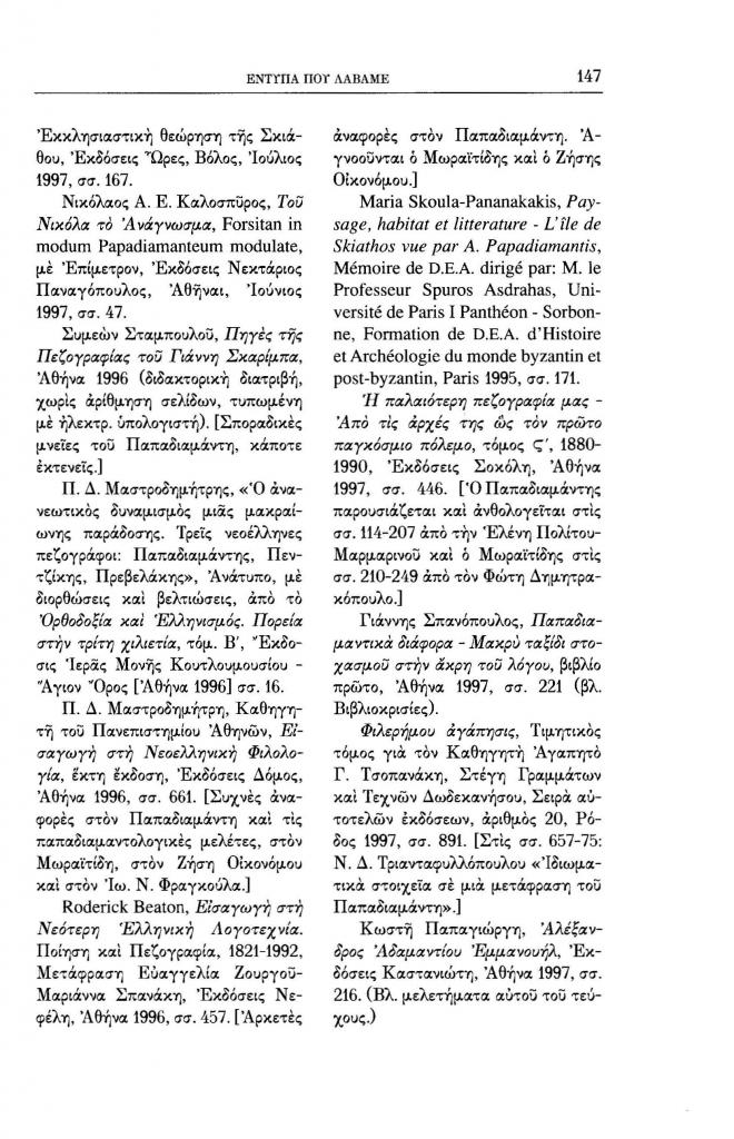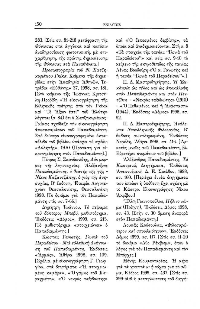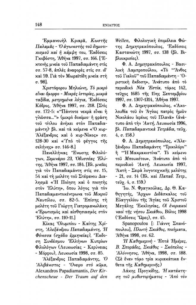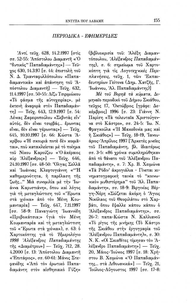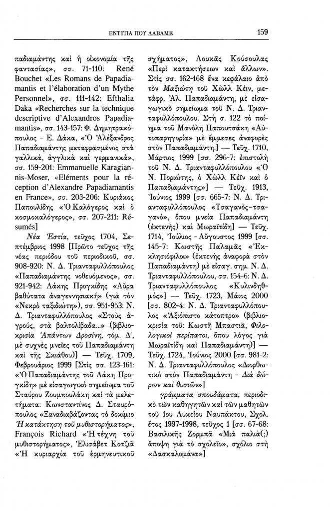 «Ενιαυτός. Έντυπα που λάβαμε [Μέχρι τέλους Ιουνίου 2000]», Παπαδιαμαντικά Τετράδια, τχ. 5 (Χριστούγεννα 2000), σ. 146-160