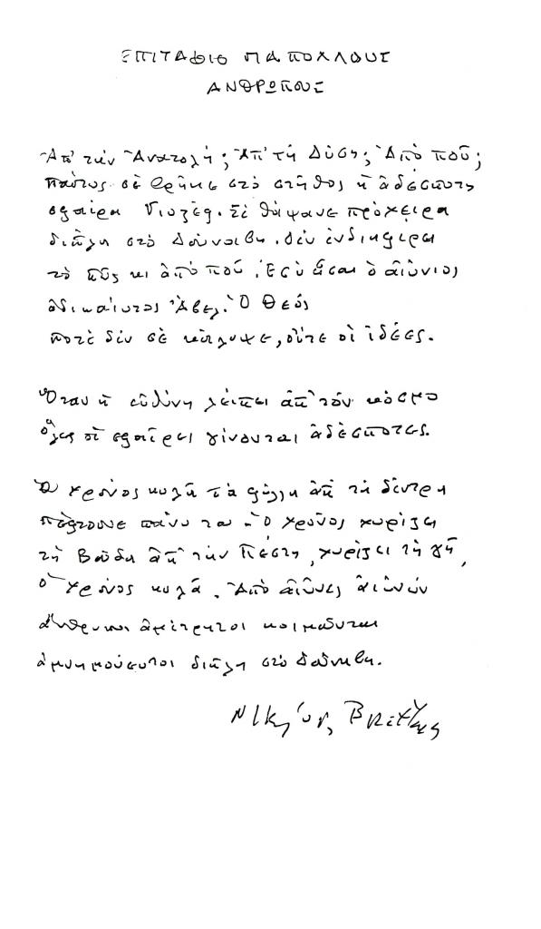 Βρεττάκος Νικηφόρος, «[Αυτόγραφο Νικηφόρου Βρεττάκου]», Πάροδος, τχ. 8 (Ιούλιος 1992), σ. 563
