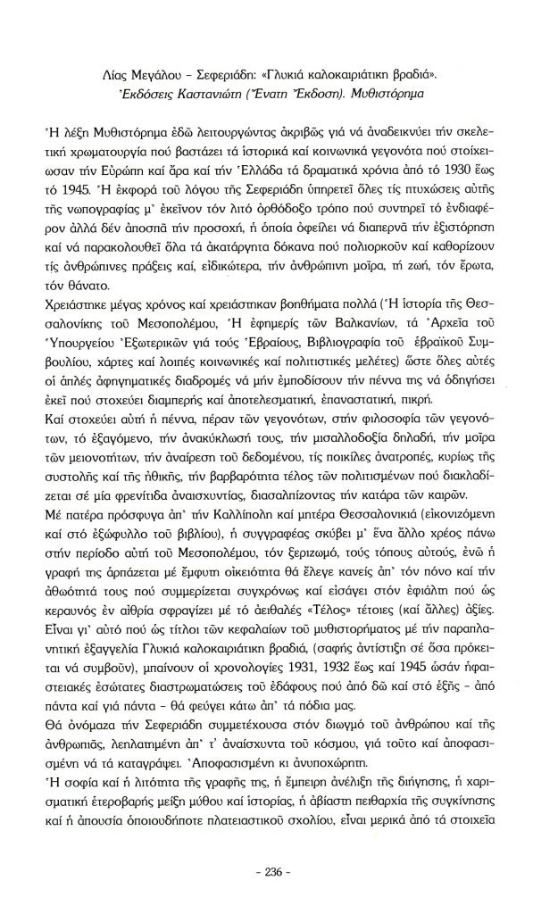 , «Λίας Μεγάλου-Σεφεριάδη: Γλυκιά καλοκαιριάτικη βραδιά. Εκδόσεις Καστανιώτη (Ένατη έκδοση). Μυθιστόρημα», Πάροδος, τχ. 3 (Μάρτιος 2004), σ. 236-237