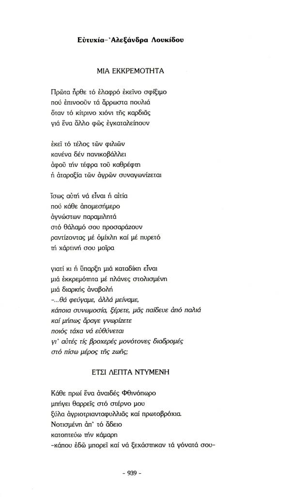 Λουκίδου Ευτυχία-Αλεξάνδρα, «Έτσι λεπτά ντυμένη», Πάροδος, τχ. 10 (Αύγουστος 2006), σ. 939-940