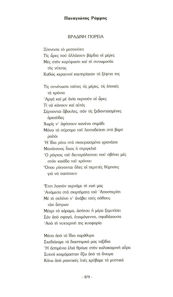 Ράμμης Παναγιώτης, «Βραδινή πορεία», Πάροδος, τχ. 9 (Ιούνιος 2006), σ. 879-880