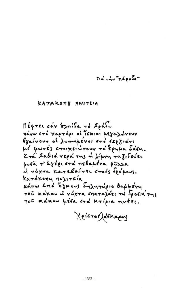 , «Κατάκοπη πολιτεία [Αυτόγραφο ποίημα του Χρίστου Λάσκαρη]»,