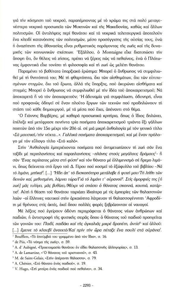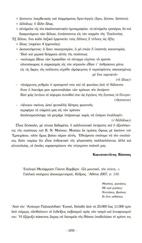 , «Το βιβλίο. Επιλογή-Μετάφραση Γιάννη Βαρβέρη: Σα μουσική, την νύχτα, Γαλλικά ποιήματα αποχαιρετισμού, Κέδρος, Αθήνα 2007, σ. 110», Πάροδος, τχ. 19 (Απρίλιος 2008), σ. 2292-2297