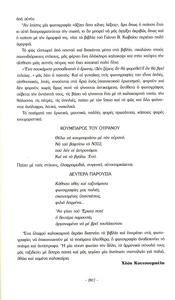 , «Το βιβλίο. Γιάννη Β. Κωβαίου: Ερωτανθοί, Φωτογραφία και Ποίηση, εκδόσεις Καλλιέπεια, 2007», Πάροδος, τχ. 23-24 (Δεκέμβριος 2008), σ. 2816-2817