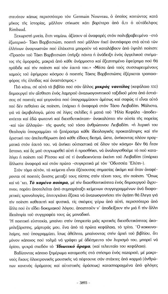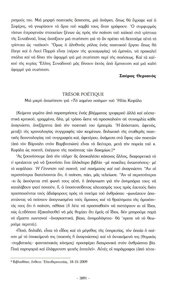 , «Το βιβλίο. Trésor poétique. Μια μικρή αναζήτηση για Το χαμένο ποίημα του Ηλία Κεφάλα», Πάροδος, τχ. 33-34 (Ιανουάριος 2010), σ. 3891-3894