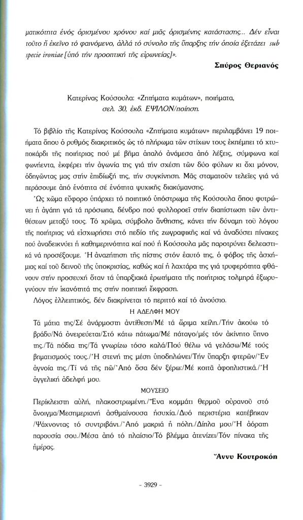 , «Το βιβλίο. Κατερίνας Κούσουλα: Ζητήματα κυμάτων, ποιήματα, σελ. 30, εκδ. Έψιλον/ποίηση», Πάροδος, τχ. 33-34 (Ιανουάριος 2010), σ. 3929