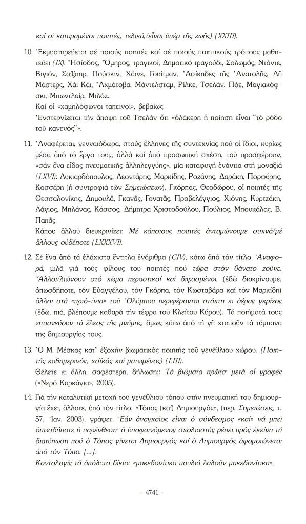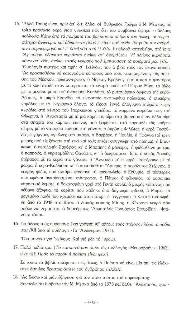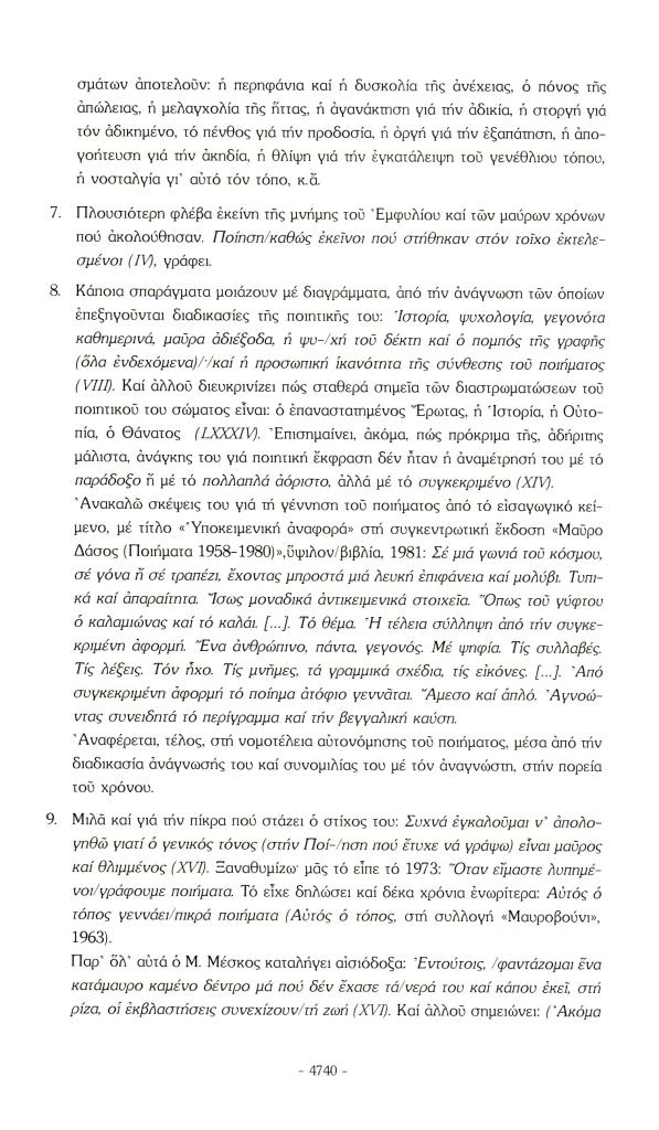 , «Το βιβλίο. Το ματωμένο γόνατο του Μάρκου Μέσκου [Σημειώσεις στα περιθώρια μιας ανάγνωσης του βιβλίου του Μ. Μέσκου Στον ενικό και πληθυντικό ψίθυρο, Νεφέλη 2009]», Πάροδος, τχ. 39-40 (Δεκέμβριος 2010), σ. 4738-4743