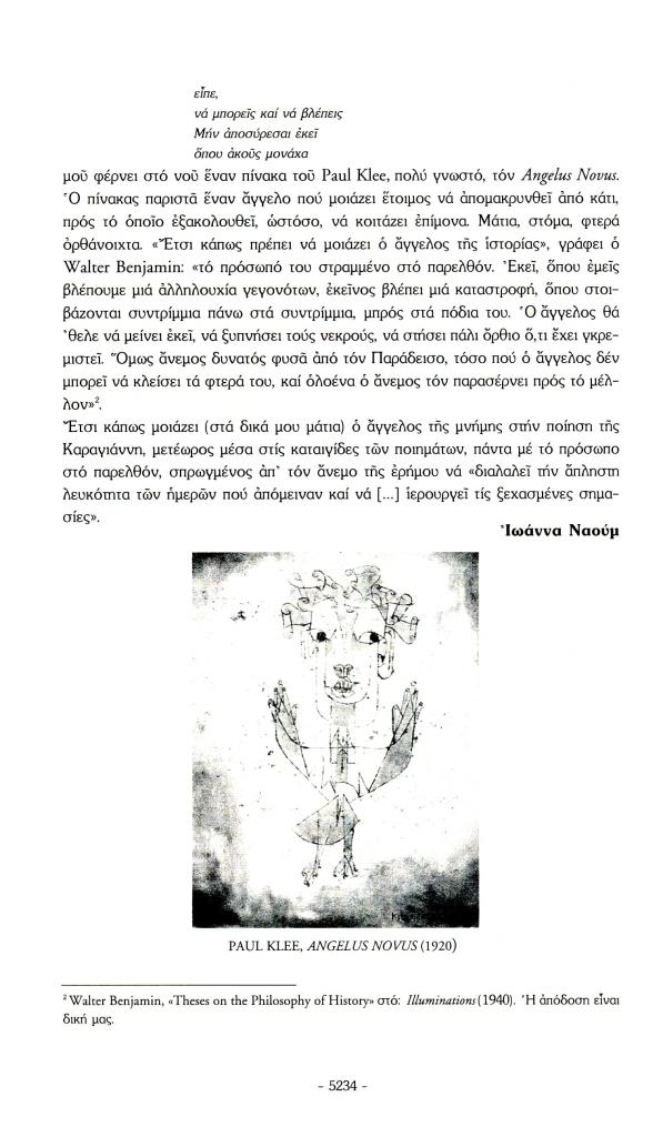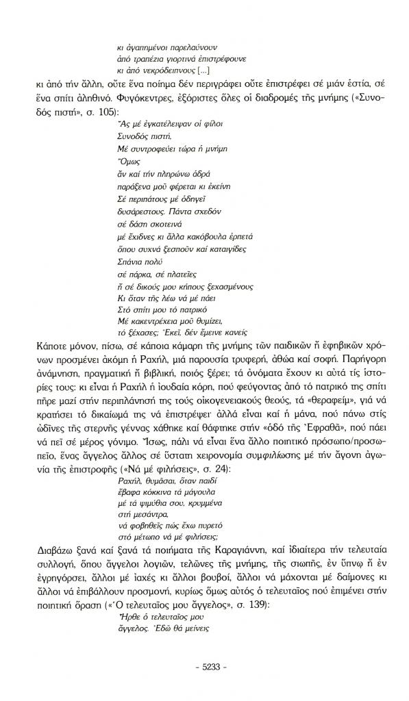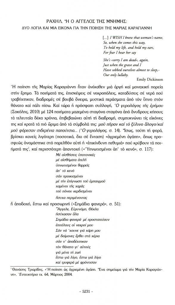 , «Ραχήλ, ή ο άγγελος της μνήμης. Δυο λόγια και μια εικόνα για την ποίηση της Μαρίας Καραγιάννη», Πάροδος, τχ. 43 (Απρίλιος 2011), σ. 5231-5234