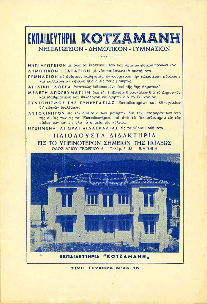 «Εκπαιδευτήρια Κοτζαμάνη», Θρακικά Χρονικά, τόμ. 1, τχ. 1 (Νοέμβριος 1960), σ. (οπισθόφυλλο)