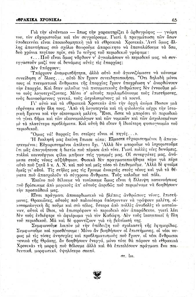 Ιωαννίδης Στέφανος, «Κρίσεις και σκέψεις. Συμπληρώνουμε και ζητούμε…», Θρακικά Χρονικά, τόμ. 4, τχ. 14 (Απρίλιος 1964), σ. 64-65