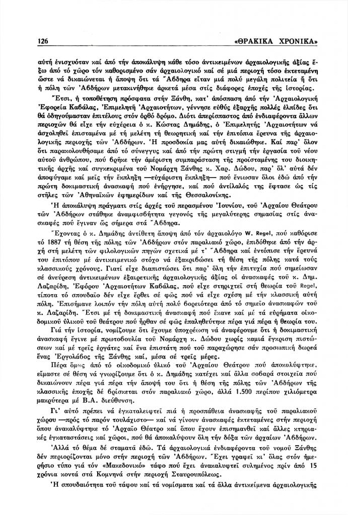 , «Η Ξάνθη: Μια περιοχή με πλούσιο αρχαιολογικό ενδιαφέρον που πρέπει ν' αξιοποιηθεί. Να αποκαλυφθεί το Αρχαίο Θέατρο των Αβδήρων», Θρακικά Χρονικά, τόμ. 5, τχ. 19 (Ιούλιος 1965), σ. 125-127