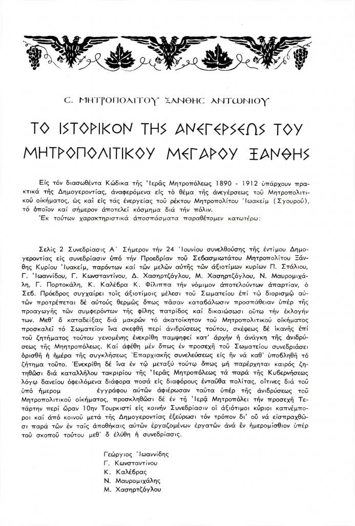 Αντώνιος Μητροπολίτης Ξάνθης, «Το ιστορικόν της ανεγέρσεως του Μητροπολιτικού Μεγάρου Ξάνθης», Θρακικά Χρονικά, τόμ. 7, τχ. 27 (Καλοκαίρι 1967), σ. 151-155