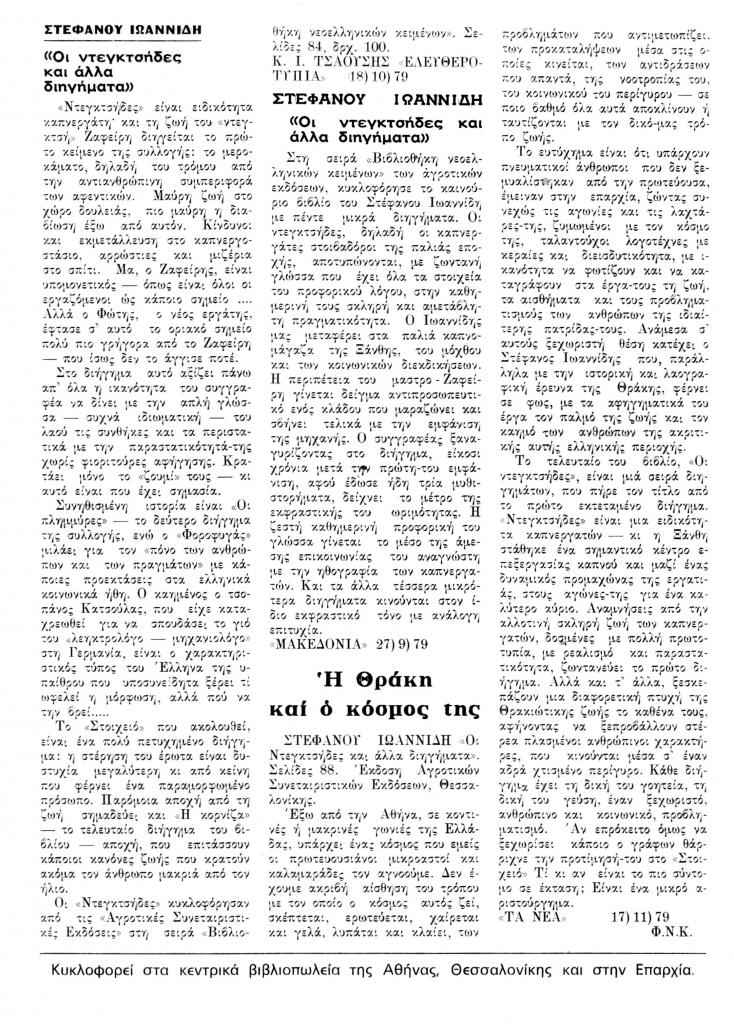 , «Η Θράκη και ο κόσμος της. Στέφανου Ιωαννίδη, Οι ντεγκτσήδες και άλλα διηγήματα, Σελίδες 88. Έκδοση Αγροτικών Συνεταιριστικών Εκδόσεων Θεσσαλονίκης», Θρακικά Χρονικά, τχ. 35 ( 1979), σ. 168