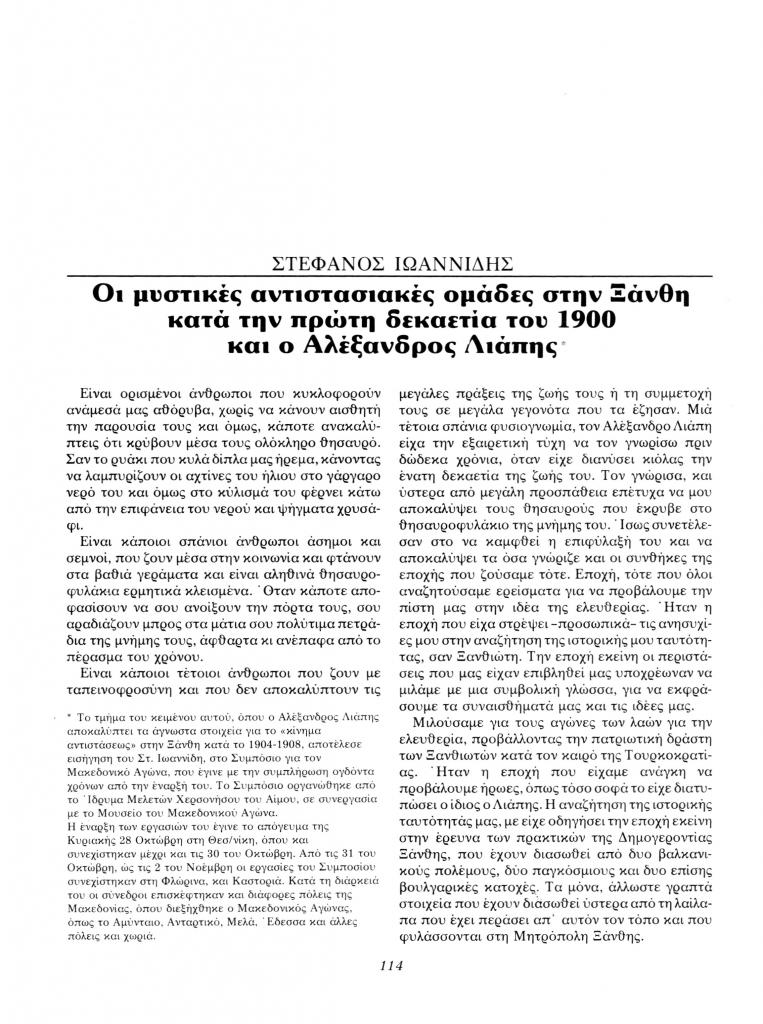 Ιωαννίδης Στέφανος, «Οι μυστικές αντιστασιακές ομάδες στην Ξάνθη κατά την πρώτη δεκαετία του 1900 και ο Αλέξανδρος Λιάπης», Θρακικά Χρονικά, τχ. 39 ( 1984), σ. 114-137