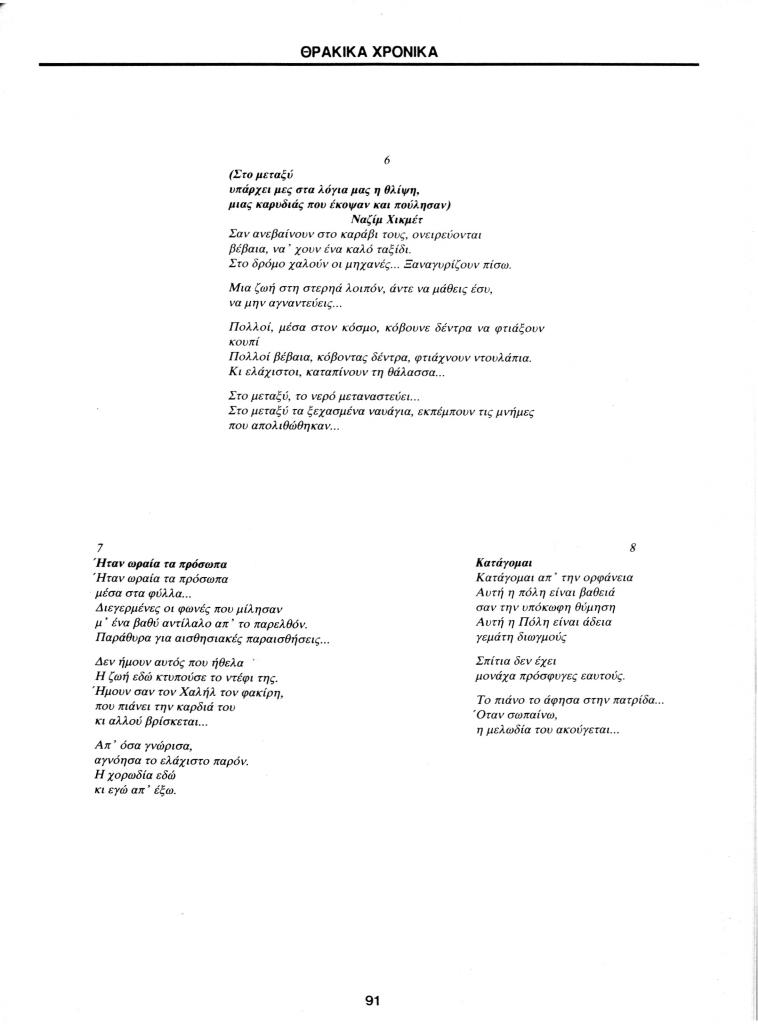 Δημητριάδου-Εφραιμίδου Ελένη, «Οκτώ ποιήματα. Ήταν ωραία τα πρόσωπα», Θρακικά Χρονικά, τχ. 43 ( 1989), σ. 91