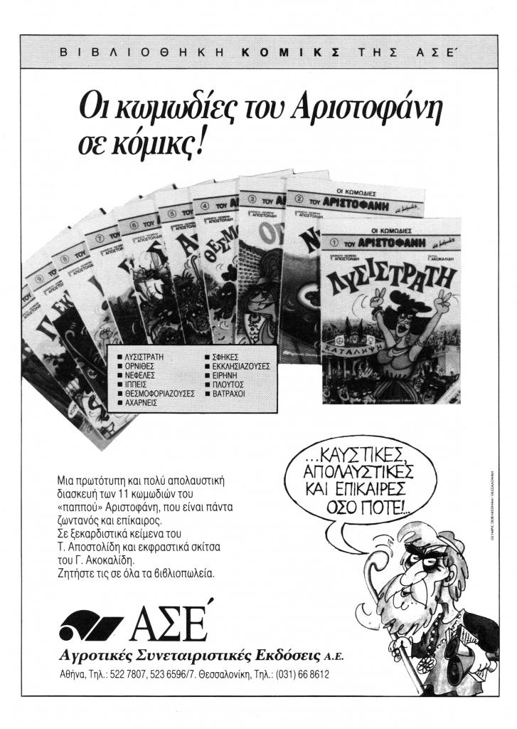 «Οι κωμωδίες του Αριστοφάνη σε κόμικς! Αγροτικές Συνεταιριστικές Εκδόσεις Α.Ε.», Θρακικά Χρονικά, τχ. 44 ( 1990), σ. 5