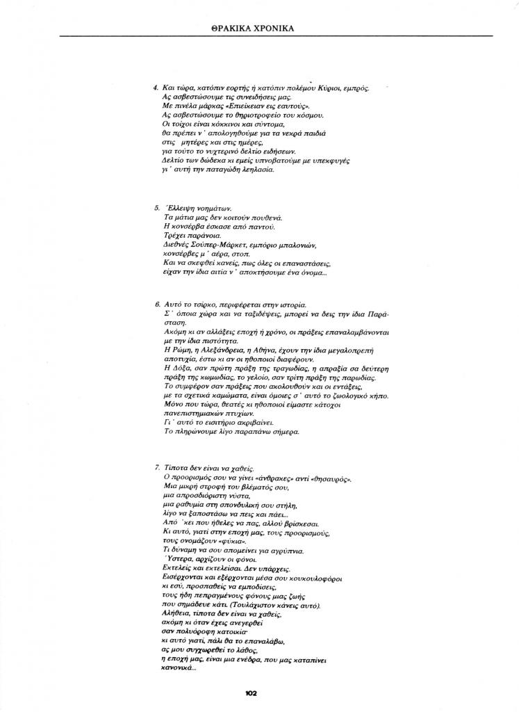 , «Επτά ποιήματα. Επτά παγκόσμιες φωτογραφίες της ήττας. 4. [Και τώρα, κατόπιν εορτής ή κατόπιν πολέμου Κύριοι, εμπρός]», Θρακικά Χρονικά, τχ. 45 ( 1991), σ. 102