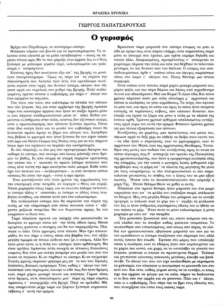 Παπατσαρούχας Γιώργος, «Ο γυρισμός», Θρακικά Χρονικά, τχ. 45 ( 1991), σ. 111