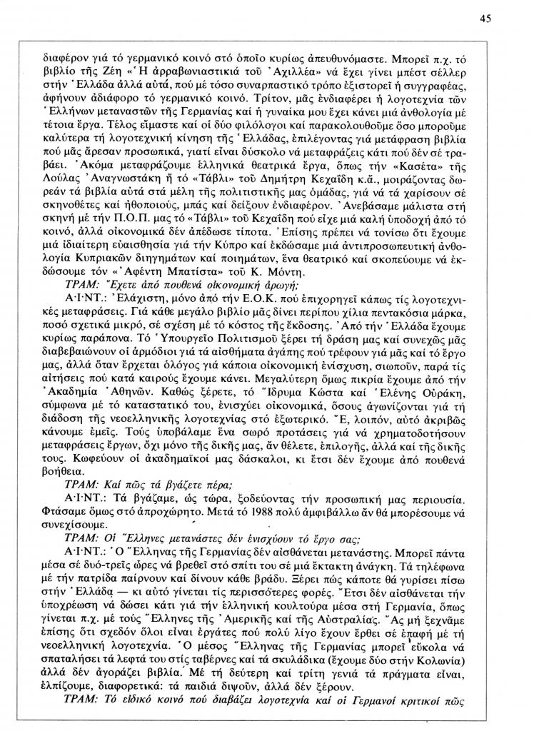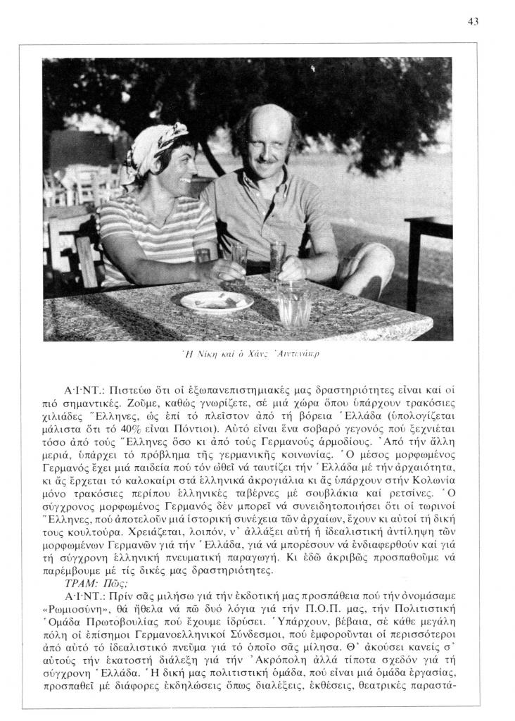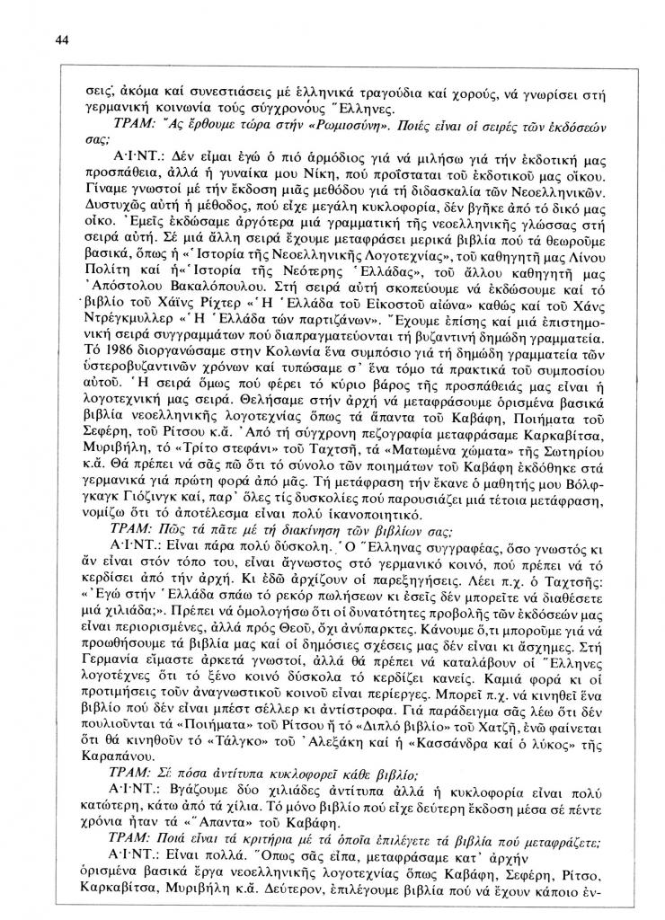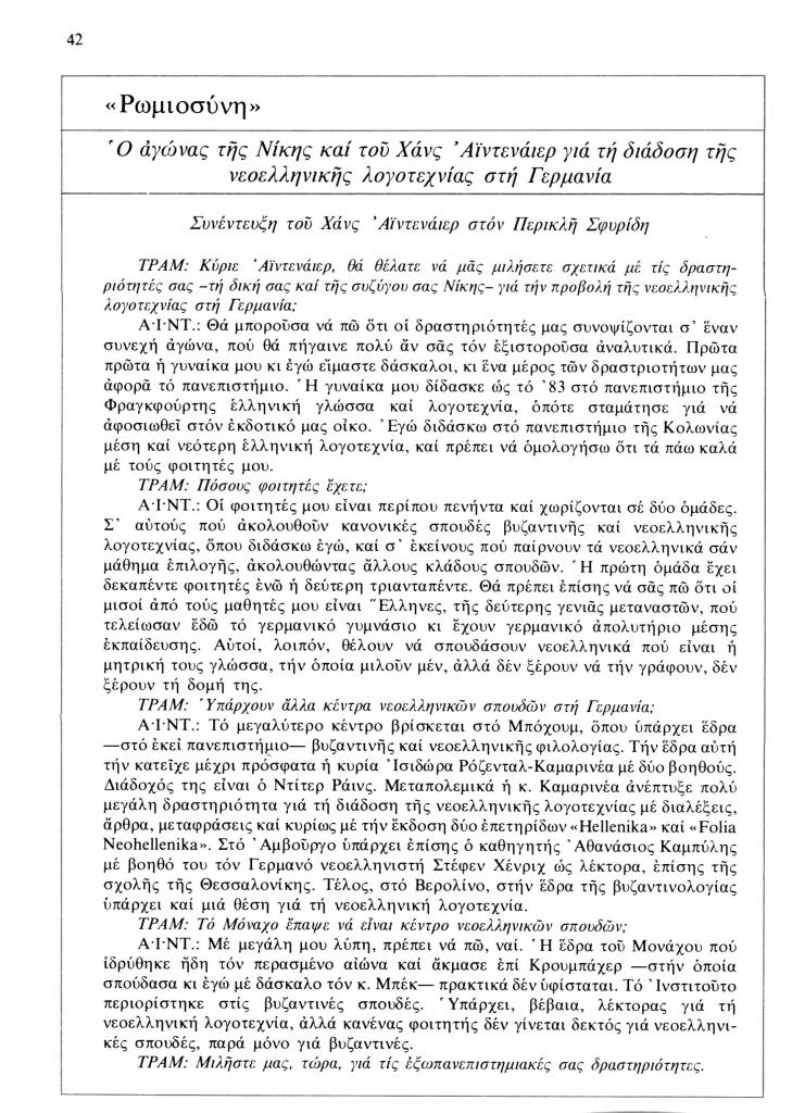 , «Ρωμιοσύνη. Ο αγώνας της Νίκης και του Χανς Αϊντενάιερ για τη διάδοση της νεοελληνικής λογοτεχνίας στη Γερμανία. Συνέντευξη του Χανς Αϊντενάιερ στον Περικλή Σφυρίδη», Το Τραμ, τχ. 6 (Μάιος 1988), σ. 42-46