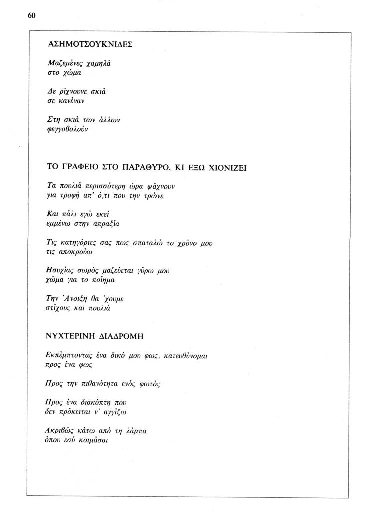 Kunze Reiner, «Ποιήματα. Το γραφείο στο παράθυρο, κι έξω χιονίζει», Το Τραμ, τχ. 8 (Φεβρουάριος 1989), σ. 60
