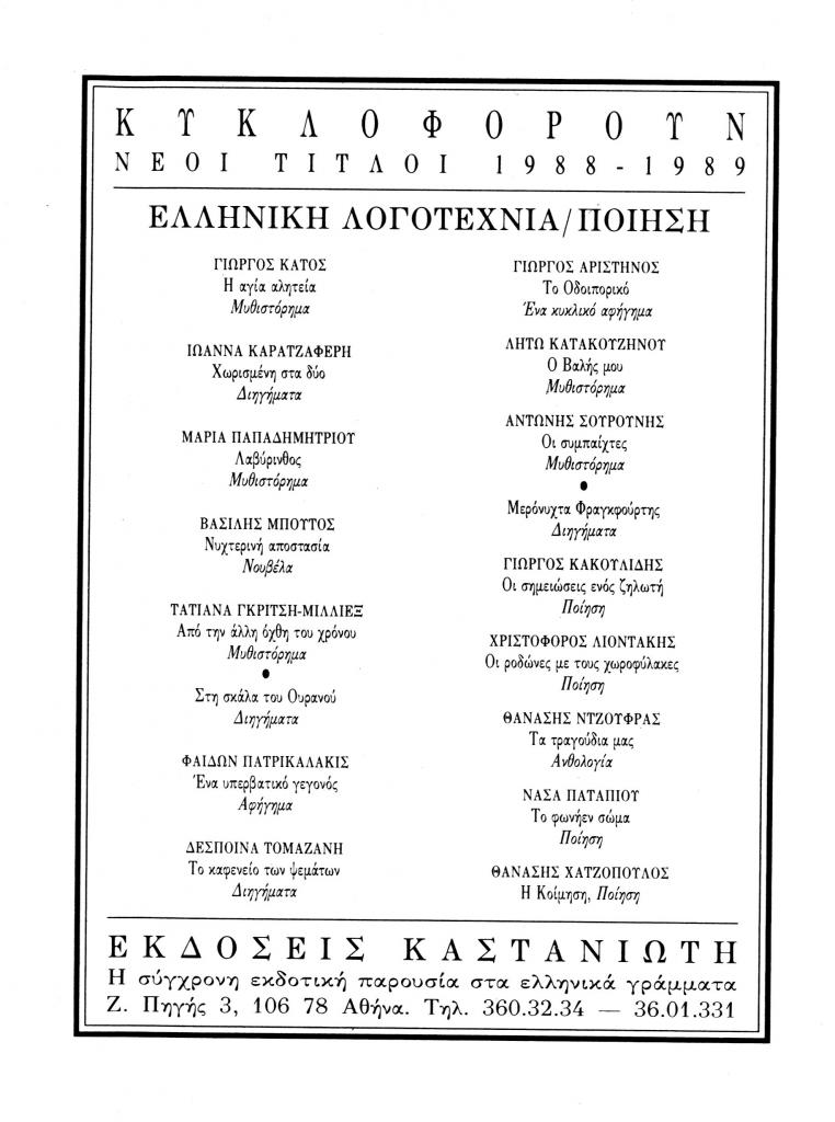 «Κυκλοφορούν. Νέοι τίτλοι 1988-1989. Ελληνική λογοτεχνία/ποίηση. Εκδόσεις Καστανιώτη», Το Τραμ, τχ. 8 (Φεβρουάριος 1989), σ. 118