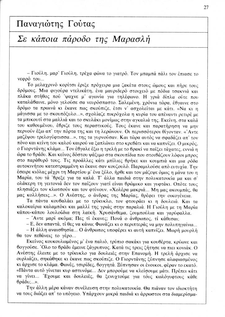 Γούτας Παναγιώτης, «Σε κάποια πάροδο της Μαρασλή», Το Τραμ, τχ. 16 (Μάιος 1991), σ. 27-28