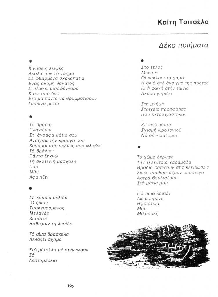 Τσιτσέλα Καίτη, «Δέκα ποιήματα. [Σε κάποια σελίδα]», Τραμ, τχ. 5 (Μάης 1977), σ. 395