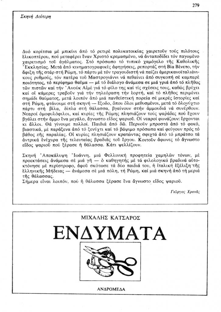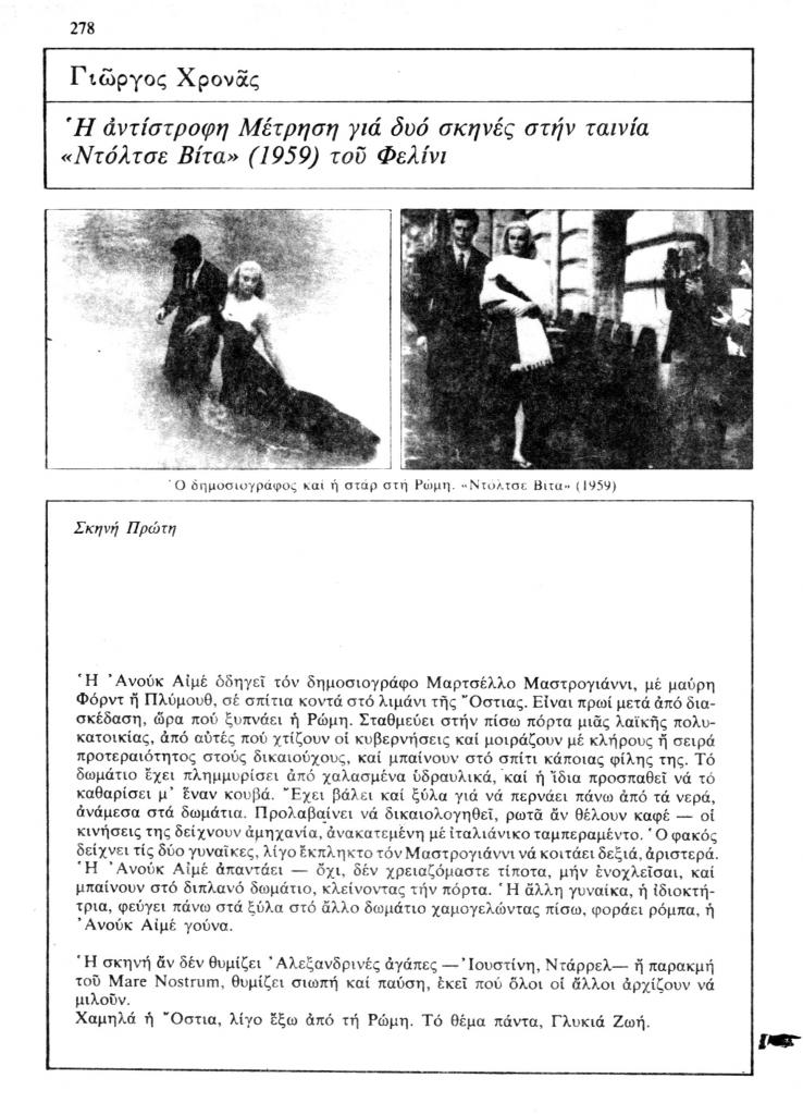 , «Η αντίστροφη μέτρηση για δυο σκηνές στην ταινία Ντόλτσε Βίτα (1959) του Φελίνι », Τραμ, τχ. 10 (Σεπτέμβρης 1978), σ. 278-279