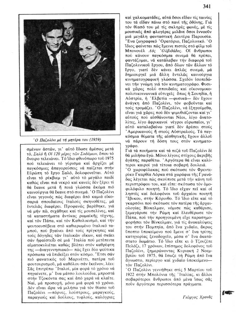 (ανυπόγραφο), «Ο Παζολίνι με τη μητέρα του (1959)», Τραμ, τχ. 10 (Σεπτέμβρης 1978), σ. 341