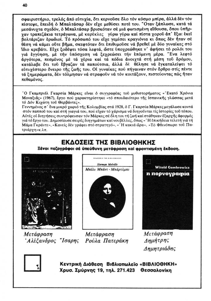 «Εκδόσεις της Βιβλιοθήκης. Ξένοι πεζογράφοι σε υπεύθυνη μετάφραση και φροντισμένη έκδοση», Τραμ, τχ. 7 (Γενάρης 1978), σ. 40